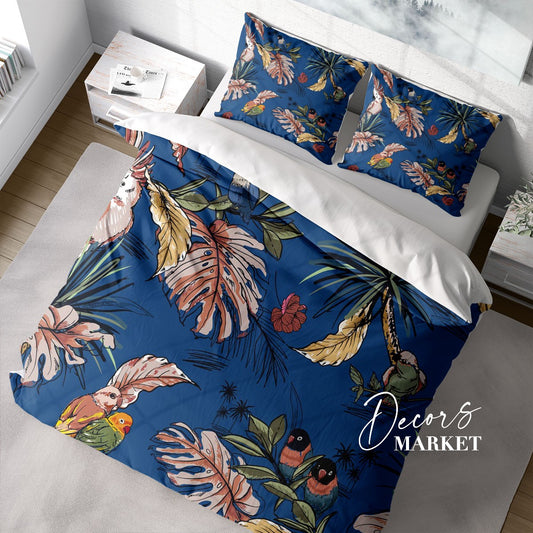 Island Parrot Monstera Duvet Cover Set w Pillowcases, Blue Floral Patterns 3D Quilt Cover, 3pc Single Double Queen King Size Doona Cover