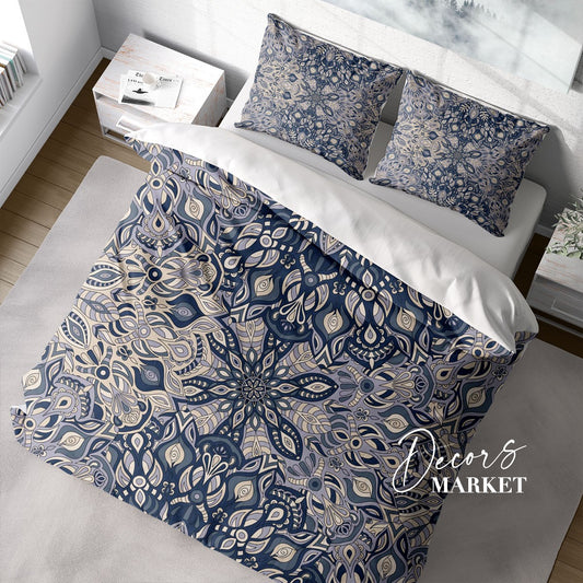 Indian Mandala Duvet Cover Set w Pillowcases, Blue Floral Patterns 3D Quilt Cover, 3pc Single Double Queen King Size Doona Cover