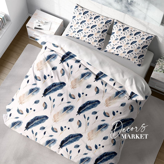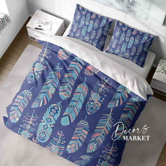 Ethnic Indian Feather Duvet Cover Set w Pillowcases, Blue Texture Patterns 3D Quilt Cover, 3pc Single Double Queen King Size Doona Cover