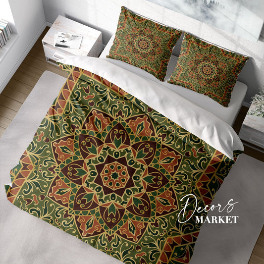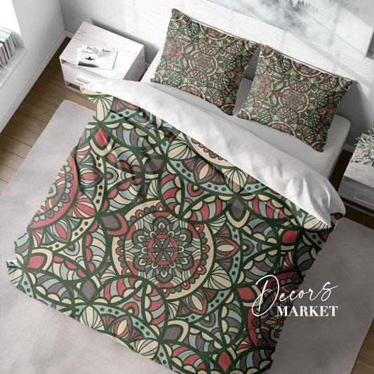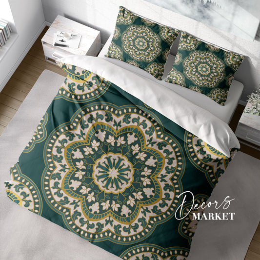 Indian Mandala Duvet Cover Set w Pillowcases, Green Floral Patterns 3D Quilt Cover, 3pc Single Double Queen King Size Doona Cover