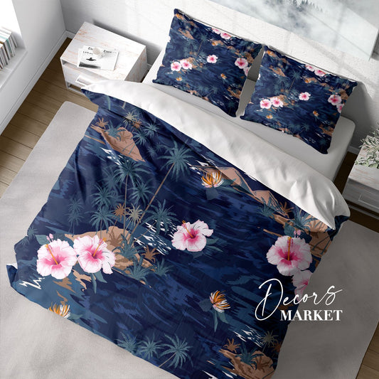 Tropical Hibiscus Frangipani Duvet Cover Set w Pillowcases, Blue Floral Patterns 3D Quilt Cover, Single Double Queen King Size Doona Cover