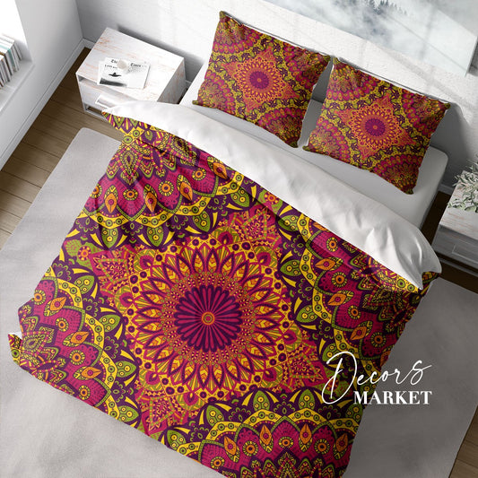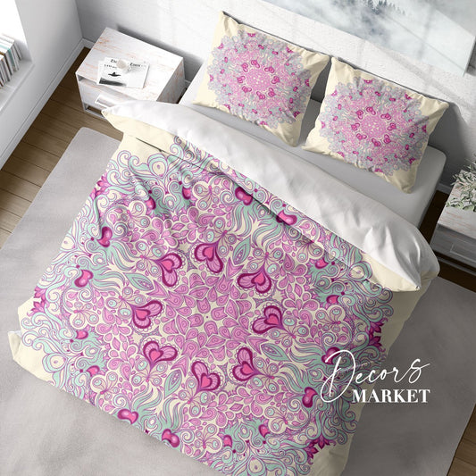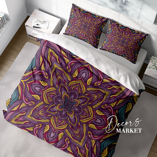 Indian Mandala Duvet Cover Set w Pillowcases, Purple Pink Floral Patterns 3D Quilt Cover, 3pc Single Double Queen King Size Doona Cover