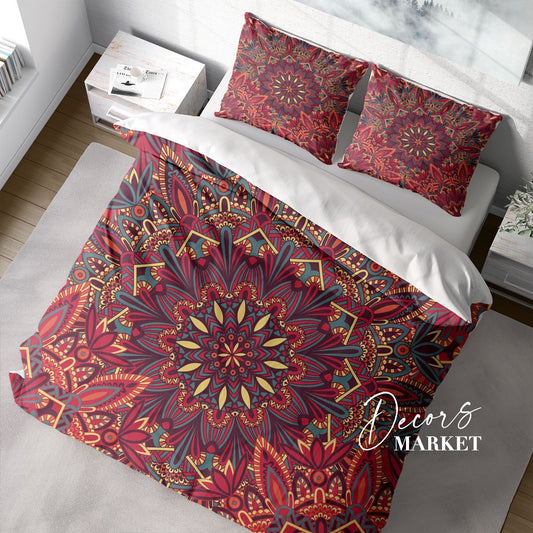 Indian Mandala Duvet Cover Set w Pillowcases, Red Symmetrical Floral Patterns 3D Quilt Cover, 3pc Single Double Queen King Size Doona Cover