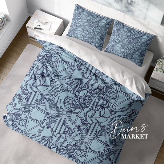 Ganpati Mandala Fantasy Duvet Cover Set w Pillowcases, Blue Texture Patterns 3D Quilt Cover, 3pc Single Double Queen King Size Doona Cover
