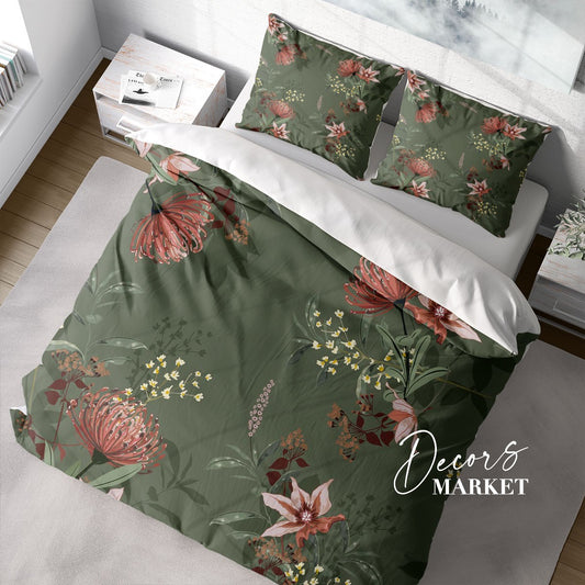 Botanical Blossom Flower Duvet Cover Set w Pillowcases, Green Floral Patterns 3D Quilt Cover, 3pc Single Double Queen King Size Doona Cover