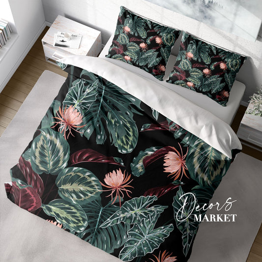 Monstera Bird Paradise Duvet Cover Set w Pillowcases, Black Floral Patterns 3D Quilt Cover, 3pc Single Double Queen King Size Doona Cover