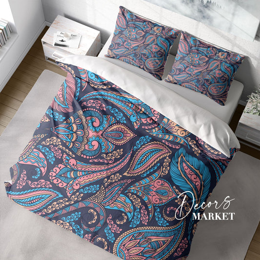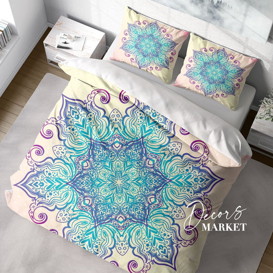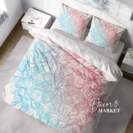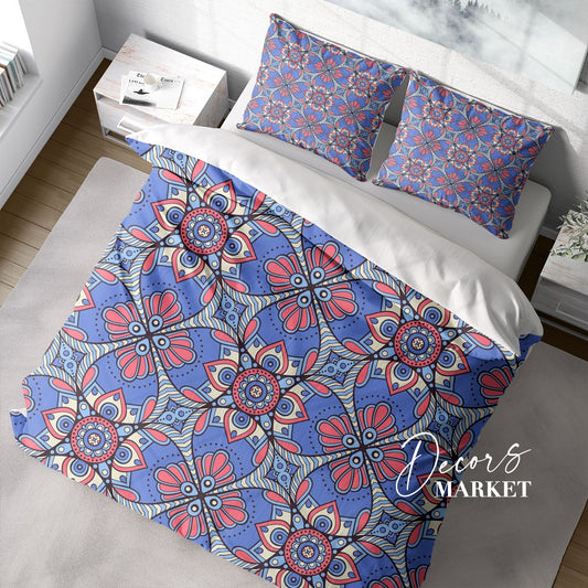 Indian Mandala Duvet Cover Set w Pillowcases, Blue Pink Floral Patterns 3D Quilt Cover, 3pc Single Double Queen King Size Doona Cover