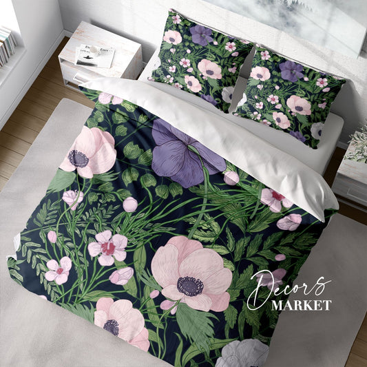 Gorgeous Wildflower Duvet Cover Set w Pillowcases, Black Floral Patterns 3D Quilt Cover, 3pc Single Double Queen King Size Doona Cover