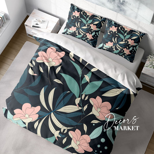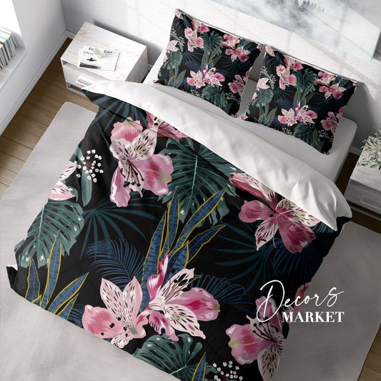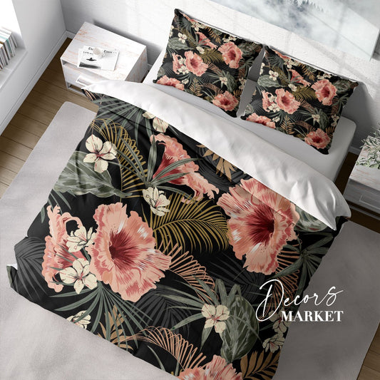 Dark Tropical Flower Duvet Cover Set w Pillowcases, Black Floral Patterns 3D Quilt Cover, 3pc Single Double Queen King Size Doona Cover