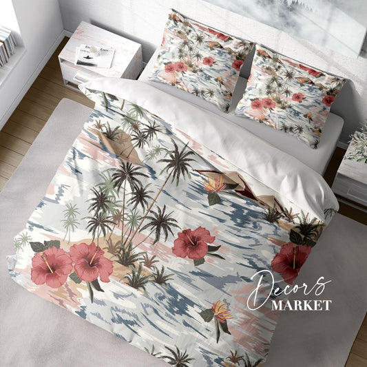Island Hibiscus Wave Duvet Cover Set w Pillowcases, Blue Floral Patterns 3D Quilt Cover, 3pc Single Double Queen King Size Doona Cover
