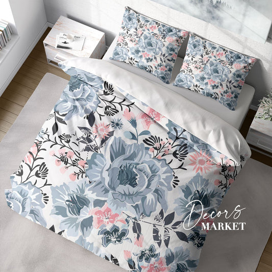 Blossom Botanical Duvet Cover Set w Pillowcases, Blue Floral Patterns 3D Quilt Cover, 3pc Single Double Queen King Size Doona Cover