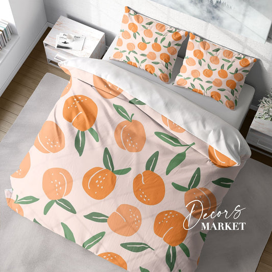 Fruits Peach Apricot Duvet Cover Set w Pillowcases, Orange Floral Patterns 3D Quilt Cover, 3pc Single Double Queen King Size Doona Cover
