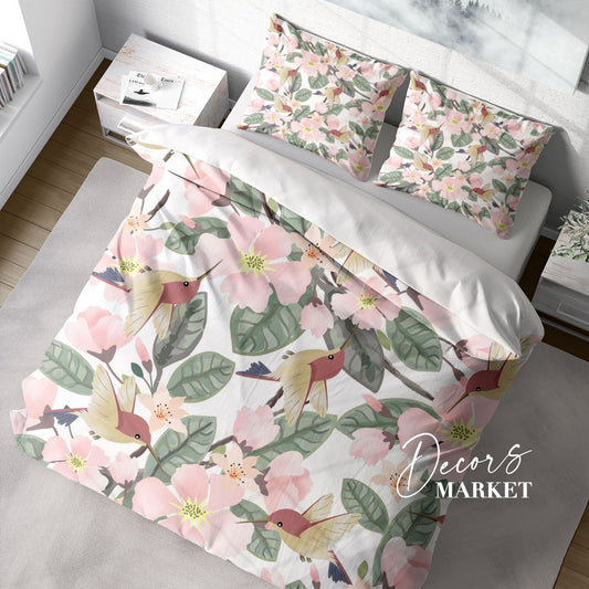 Cute Hummingbird Flower Duvet Cover Set w Pillowcases, Pink Floral Patterns 3D Quilt Cover, 3pc Single Double Queen King Size Doona Cover