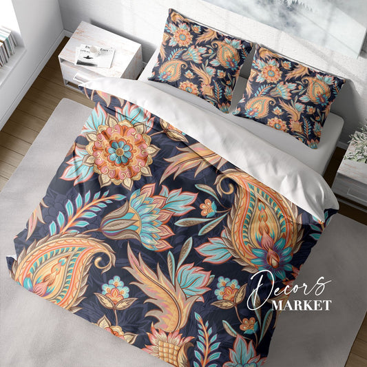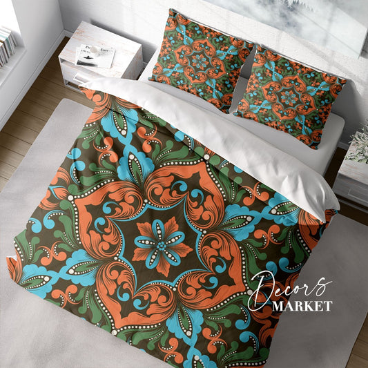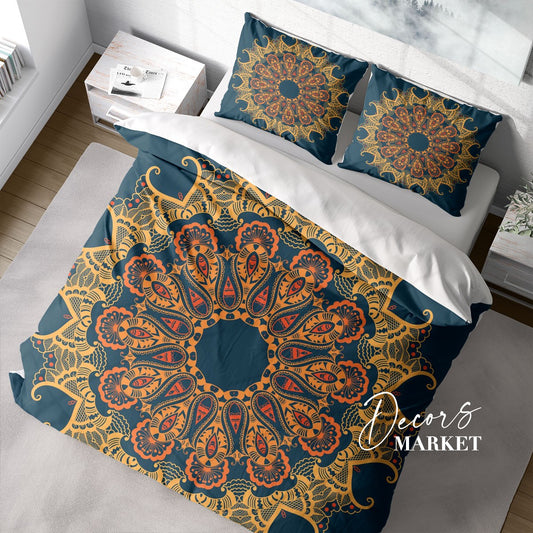 Indian Mandala Duvet Cover Set w Pillowcases, Blue Orange Floral Patterns 3D Quilt Cover, 3pc Single Double Queen King Size Doona Cover