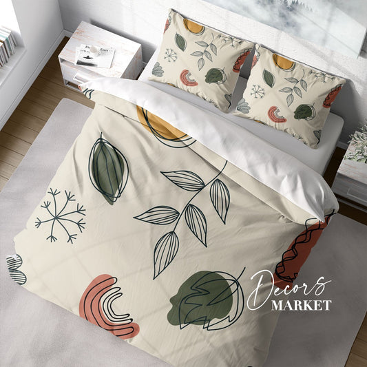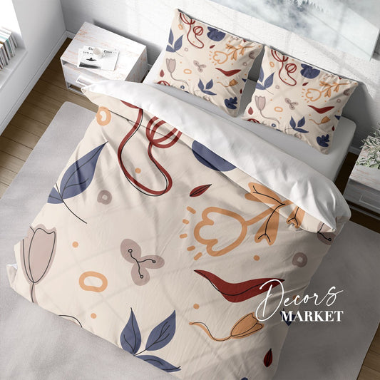 Swirl Leaf Flower Sketch Duvet Cover Set w Pillowcases, Creamy Floral Patterns 3D Quilt Cover, 3pc Single Double Queen King Size Doona Cover