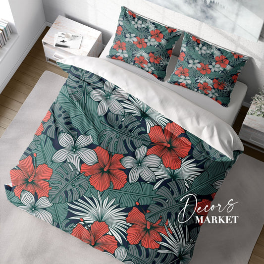 Hawaiian Hibiscus Leaf Duvet Cover Set w Pillowcases, Green Floral Patterns 3D Quilt Cover, 3pc Single Double Queen King Size Doona Cover