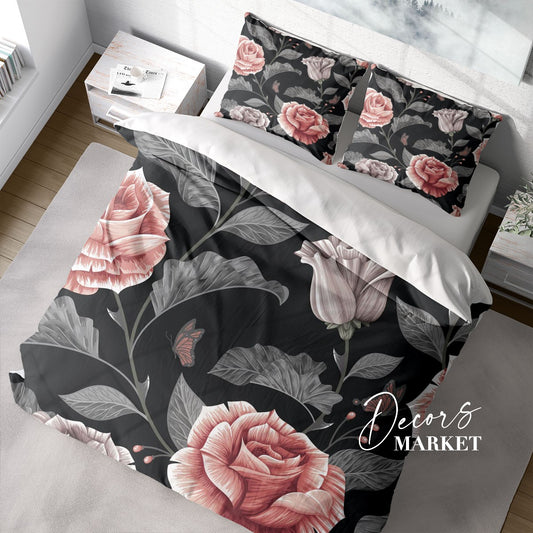 Dark Blossom Roses Duvet Cover Set w Pillowcases, Black Floral Patterns 3D Quilt Cover, 3pc Single Double Queen King Size Doona Cover