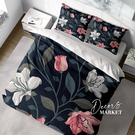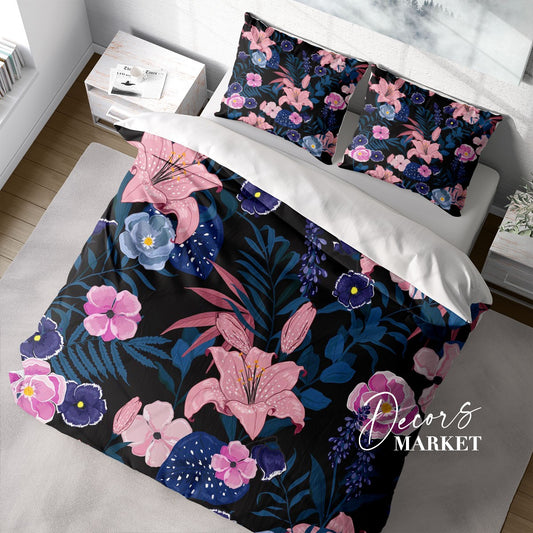 Dark Tropical Lily Duvet Cover Set w Pillowcases, Black Floral Patterns 3D Quilt Cover, 3pc Single Double Queen King Size Doona Cover