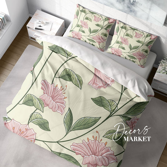 Pastel Flower Leaves Duvet Cover Set w Pillowcases, Pink Floral Patterns 3D Quilt Cover, 3pc Single Double Queen King Size Doona Cover