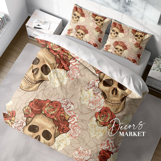 Muertos Rose Skull Duvet Cover Set w Pillowcases, Red Texture Patterns 3D Quilt Cover, 3pc Single Double Queen King Size Doona Cover