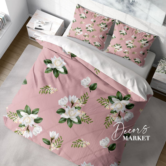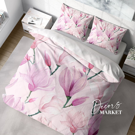 Magnolia Watercolor Duvet Cover Set w Pillowcases, Pink Floral Patterns 3D Quilt Cover, 3pc Single Double Queen King Size Doona Cover