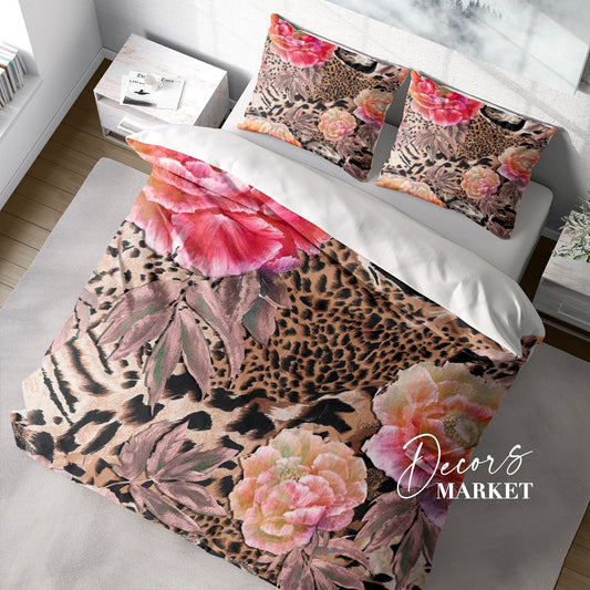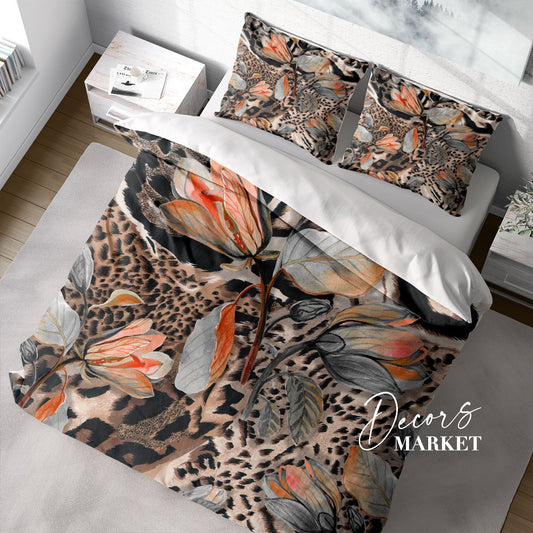 Textile Floral Leopard Duvet Cover Set w Pillowcases, Brown Texture Patterns 3D Quilt Cover, 3pc Single Double Queen King Size Doona Cover