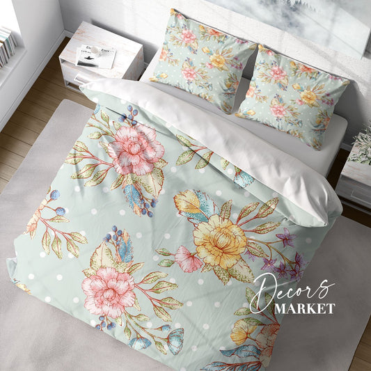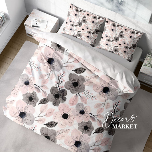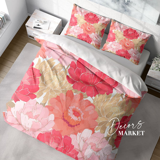 Pastel Flower Colors Duvet Cover Set w Pillowcases, Pink Floral Patterns 3D Quilt Cover, 3pc Single Double Queen King Size Doona Cover