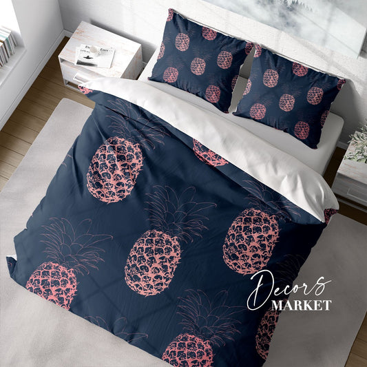 Tropical Pineapple Duvet Cover Set w Pillowcases, Blue Floral Patterns 3D Quilt Cover, 3pc Single Double Queen King Size Doona Cover