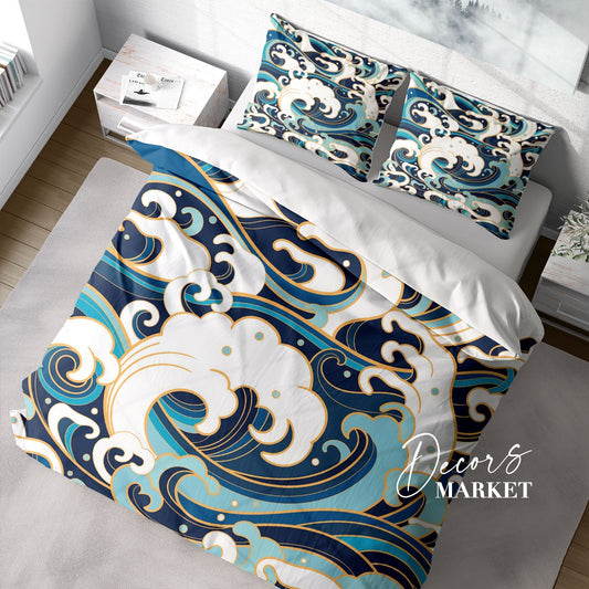 Ukiyoe Wave Art Duvet Cover Set w Pillowcases, Blue Texture Patterns 3D Quilt Cover, 3pc Single Double Queen King Size Doona Cover