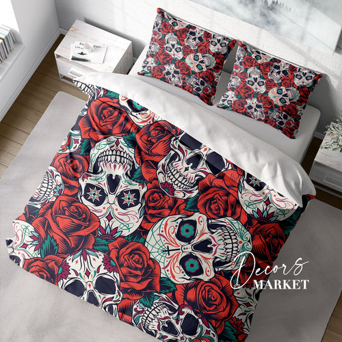 Skull Rose Muertos Duvet Cover Set w Pillowcases, Red Texture Patterns 3D Quilt Cover, 3pc Single Double Queen King Size Doona Cover