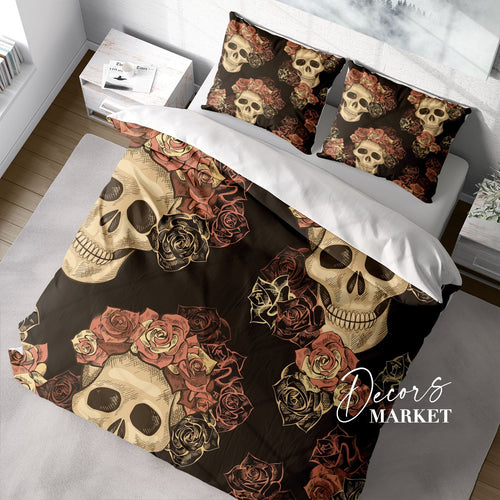 Muertos Skull Rose Duvet Cover Set w Pillowcases, Black Texture Patterns 3D Quilt Cover, 3pc Single Double Queen King Size Doona Cover