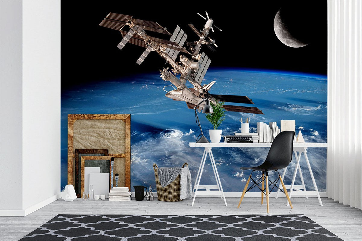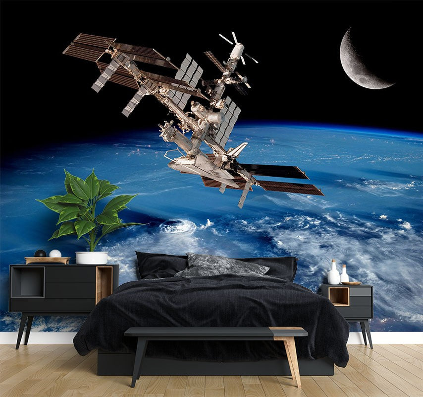 Space Station Nature Blue Wallpaper Mural,Self-Adhesive Peel And Stick 3D Wall Paper,Bedroom Removable Wall Decor
