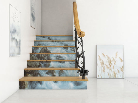 Valley River Nature Waterfall White Stair Riser Decals, Waterproof Removable Staircase Decals, Vinyl Peel And Stick Stairs Decal Stickers