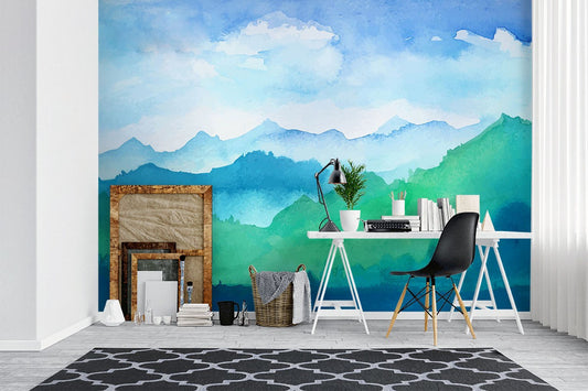 Mountain Cloud Art Watercolor Green Wallpaper Mural,Self-Adhesive Peel And Stick 3D Wall Decor,Australian Company Bedroom Wall Decor