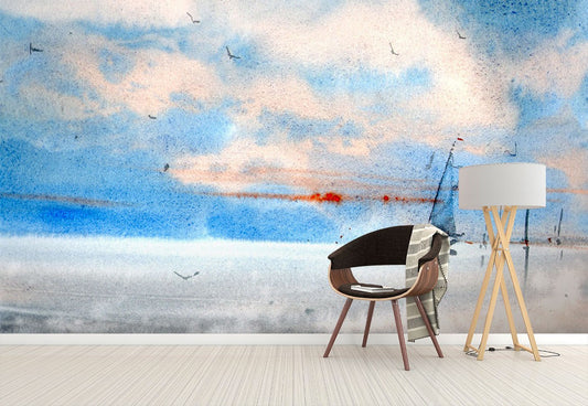 Sailing Island Art Watercolor Blue Wallpaper Mural,Self-Adhesive Peel And Stick 3D Wall Decor,Removable Bedroom Wall Decor