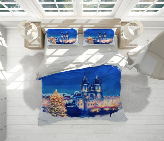 Castle Christmas Art Watercolor Blue 3D Duvet Cover Set W Pillow Cover, Single Double Queen King Size, Printed Cotton Quilt Doona Cover