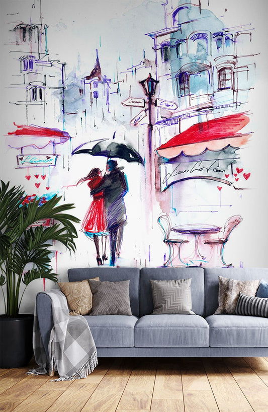 Paris Couple Art Watercolor Red Wallpaper Mural,Self-Adhesive Peel And Stick 3D Wall Decal,Designer Australian Company Wall Decor
