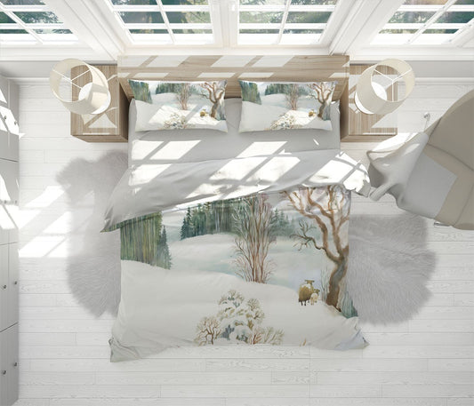 Winter Snow Village Duvet Cover Set W Pillow Cover, White Art Watercolor 3D Quilt Cover, Single Double Queen King Size Doona Cover