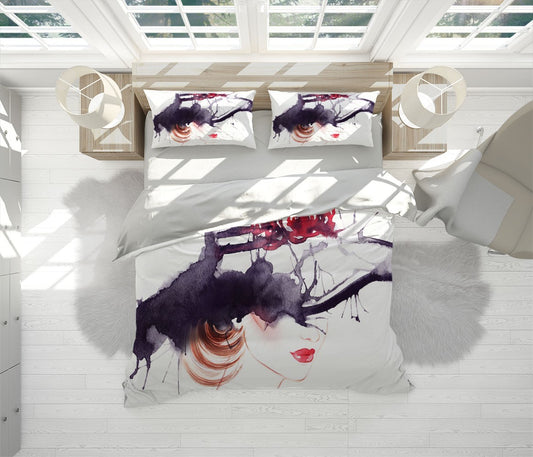 Hat Woman Duvet Cover Set W Pillow Cover, Black Art Watercolor 3D Quilt Cover, Single Double Queen King Size Doona Cover