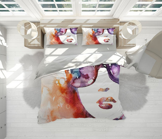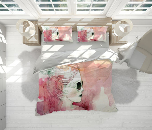 Fashion Girl Duvet Cover Set W Pillow Cover, Pink Art Watercolor 3D Quilt Cover, Single Double Queen King Size Doona Cover