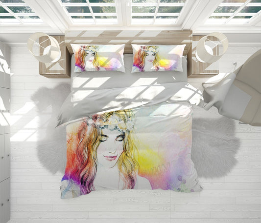 Woman Portrait Duvet Cover Set W Pillow Cover, Yellow Art Watercolor 3D Quilt Cover, Single Double Queen King Size Doona Cover