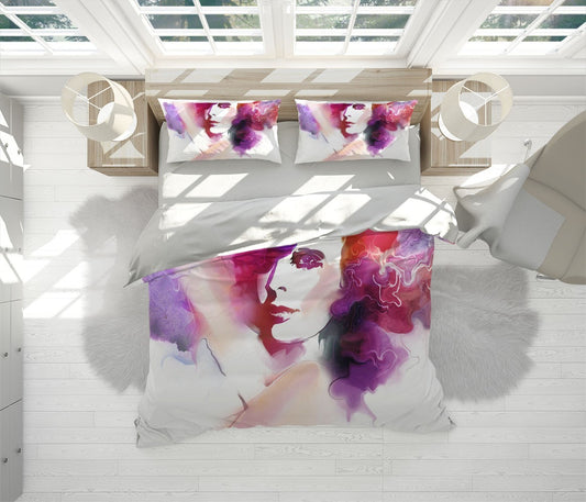 Girl Portrait Duvet Cover Set W Pillow Cover, Purple Art Watercolor 3D Quilt Cover, Single Double Queen King Size Doona Cover