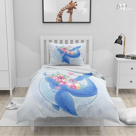 Wreath Whale Duvet Cover Set w Pillow Cover, Blue Art Watercolor 3D Quilt Cover, Single Double Queen King Size Doona Cover