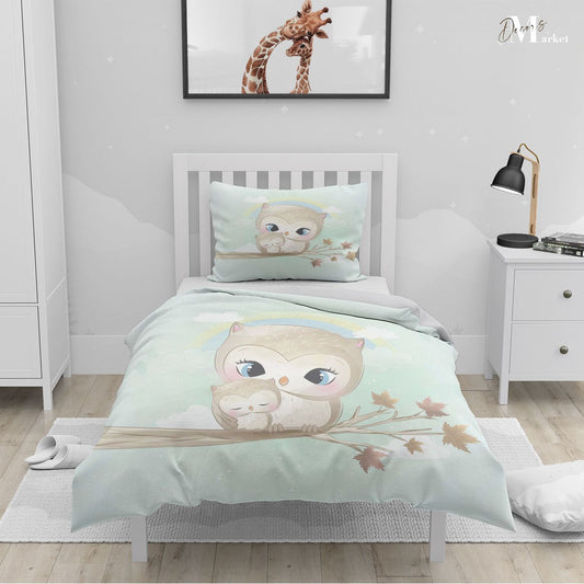 Mommy Baby Owl Duvet Cover Set w Pillow Cover, Brown Art Watercolor 3D Quilt Cover, Single Double Queen King Size Doona Cover