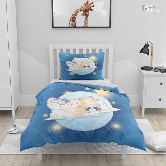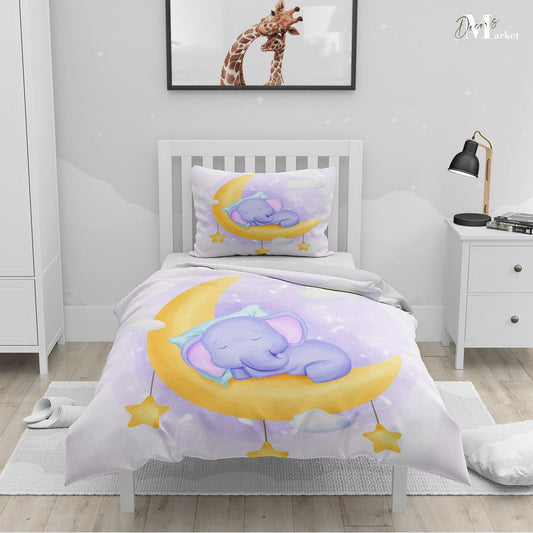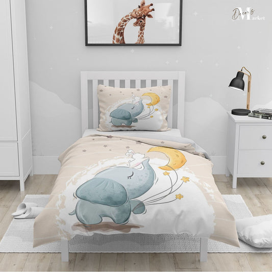 Elephant Rabbit Moon Duvet Cover Set w Pillow Cover, Creamy Art Watercolor 3D Quilt Cover, Single Double Queen King Size Doona Cover