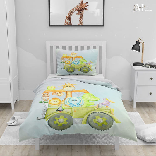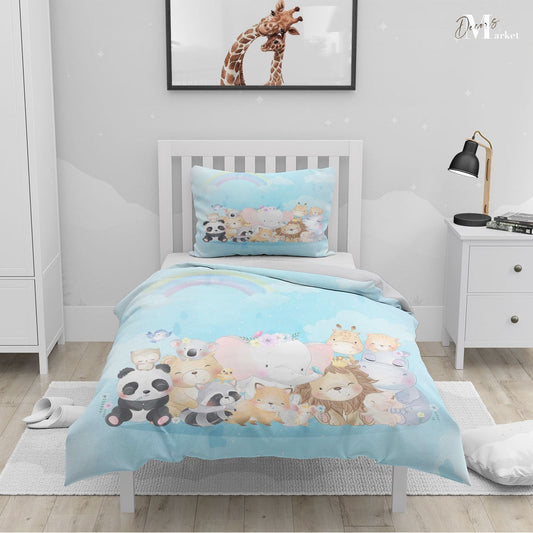 Baby Animal Friends Duvet Cover Set w Pillow Cover, Blue Art Watercolor 3D Quilt Cover, Single Double Queen King Size Doona Cover