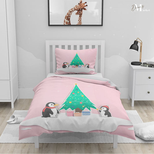 Penguin Christmas Duvet Cover Set w Pillow Cover, Pink Art Watercolor 3D Quilt Cover, Single Double Queen King Size Doona Cover
