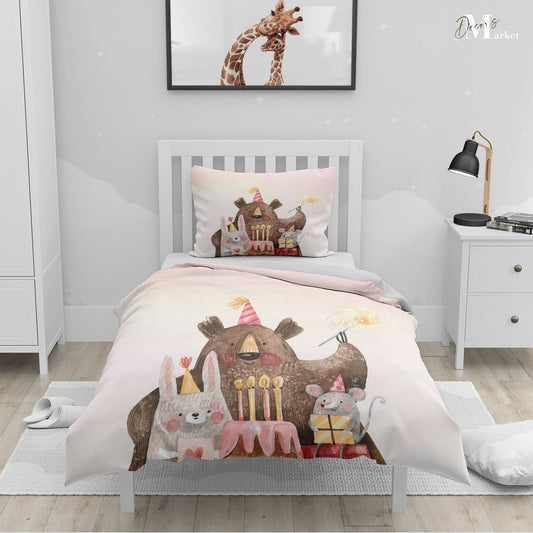 Bear Birthday Cake Duvet Cover Set w Pillow Cover, Brown Art Watercolor 3D Quilt Cover, Single Double Queen King Size Doona Cover