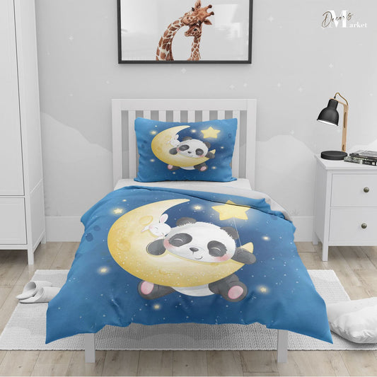 Moon Star Panda Duvet Cover Set w Pillow Cover, Blue Art Watercolor 3D Quilt Cover, Single Double Queen King Size Doona Cover