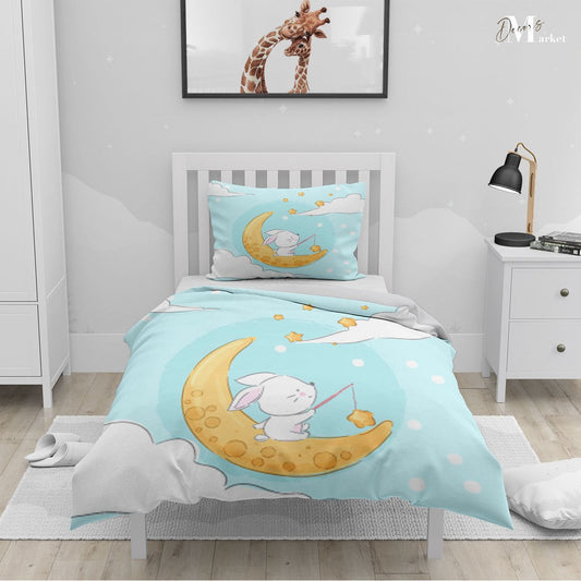 Cloud Moon Rabbit Duvet Cover Set w Pillow Cover, Blue Art Watercolor 3D Quilt Cover, Single Double Queen King Size Doona Cover